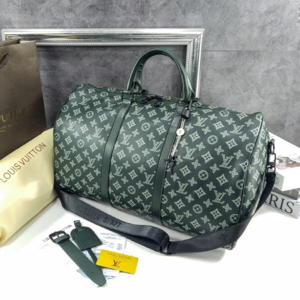 자연스러운 그린 색상의 모노그램 섀도우 카프스킨 소재로 선보이는 키폴 반둘리에 50. 유연한 가죽 소재에 모노그램을 양각으로 새기고 그 위에 더 밝은 색상으로 프린트한 디자인. 기내용으로 적합한 크기. 내부의 지퍼형 포켓. 하드웨어와 동일한 블랙 색상의 조절 가능한 탈착형 숄더 스트랩.