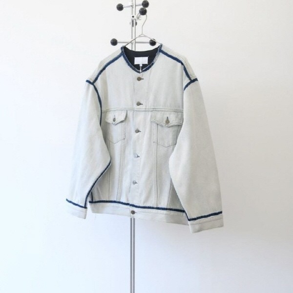 •Maison Margie** 오버핏 스타일의 노칼라 데님 재킷은 남녀 공용 제품으로 오리지널을 구입해 개발했습니다. 원단은 터키산 13.5oz 순면 데님을 사용해 피부에 닿는 감촉이 부드럽고 편안하며, 의류 전체에 2회에 걸친 고중량 워싱 공정을 적용했습니다. 총 6회의 표면 작업을 거쳐야만 구현되는 '아이스 블루' 톤은 처리 과정이 매우 복잡하고 원단 소모도 큰 편입니다. 버튼은 일본의 수입사(지아메이)에서 공급받은 고급 버튼을 사용했고, 안감은 착용감이 우수하도록 몸에 밀착되게 복합 처리되어 단독 착장에 특히 잘 어울리는 아이템입니다.