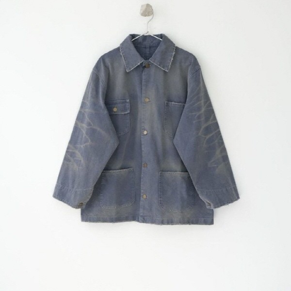 •오리지널 레퍼런스를 기반으로 개발되었으며, 고중량 면 캔버스를 사용했습니다. 특수 무두질과 선축 가공을 통해 형태는 단단하게 잡아주면서 내구성을 높였습니다. 여러 단계의 수작업 데미지 공정을 적용했는데, 사포 샌딩, 효소 워싱으로의 탈색, 가장자리 트리밍(찢김) 처리 등을 통해 칼라, 소매, 밑단 같은 하중이 많이 실리는 부위에 자연스러운 그라데이션 페이딩을 구현하여 장기간 착용한 듯한 빈티지 무드를 재현했습니다.